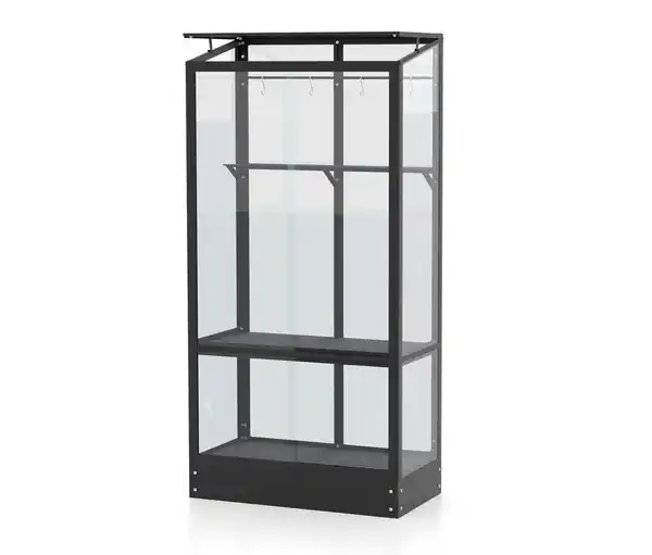 Vitavia Balkongewächshaus mit Standfundament, schwarz Farbe: Schwarz Material: Rahmen Aluminium, pulverbeschichtet Fundament Stahl, verzinkt mit Einbrennlackierung Verglasungsart Einscheiben-Sicherheitsglas (ESG) Maße: B x H x T außen ca. 81 x 165 x 43 cm Grundfläche ca. 0,35 m² Höhe Traufe ca. 156 cm Türöffnung oben ca. 35 x 95 cm, unten ca. 35 x 36 cm Höhe Fach unten ca. 40 cm, oben ca. 100 cm Inhalt: Inkl. Montageanleitung Gewicht: Ca. 44,3 kg Sonstige Hinweise: Artikel wird zerlegt geliefert Lieferung in 3 Packstücken bis zur Bordsteinkante per Postversand Keine Inselbelieferung B x H x T Packstücke 1x ca. 154 x 11 x 18 cm, 1x ca. 83 x 8,5 x 15,5 cm, 1x ca. 115 x 4,5 x 48 cm Gewicht Packstücke 1x ca. 11,7 kg, 1x ca. 3,1 kg, 1x ca. 29 kg Kompaktes Gewächshaus für den Balkon und TerrasseMit aufstellbarem DachfensterScheiben aus kristallklarem Einscheiben-Sicherheitsglas (ESG)2 getrennt voneinander bedienbare SchiebetürenZwischenregal für zusätzliche PflanzflächeAlle Fenster sind klammerfrei in Aluminiumprofile eingefasst: Aluminium ist rostresistent und daher besonders witterungsbeständig und langlebig
