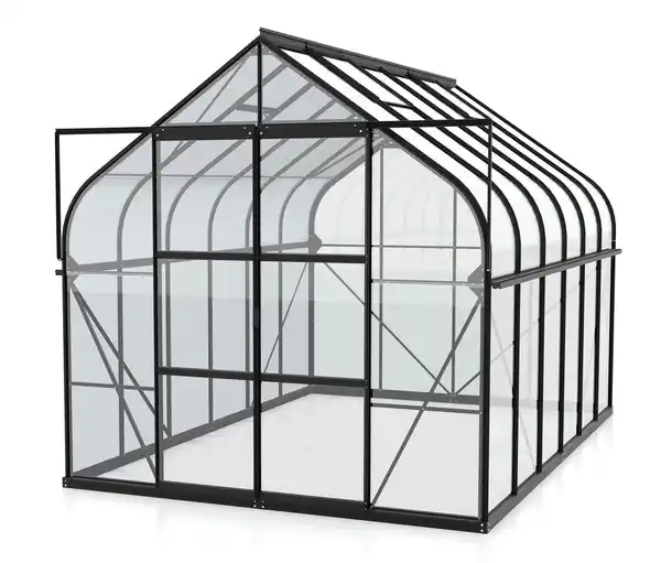 Vitavia Gewächshaus, ESG 8,3 m² inkl. Rahmenfundament Farbe: Rahmen schwarz Glas kristallklar Material: Pulverbeschichtete Aluminiumprofile Verglasung Einscheiben-Sicherheitsglas (ESG), gebogende Scheiben 100% Polycarbonat Maße: B x H x T ca. 264 x 261 x 321 cm Grundfläche ca. 8,3 m² Firsthöhe ca. 261 cm Traufenhöhe ca. 130 cm Höhere Seiten durch Glockendach ca. 142 cm Sockelmaß ca. 254 x 317 cm Tür ca. 122 x 200 cm Inhalt: Inkl. Stahlrahmenfundament, Schiebetür, aufstellbarem Dachfenster, integrierter Regenrinne, Montagematerial und -anleitung Gewicht: Ca. 275,6 kg Gebrauchsanweisung: - Eloxierte oder pulverbeschichtete Aluminiumprofile - sorgen für dauerhaften Schutz vor Korrosion - Inkl. Dachfenster und Regenrinnen - Sicherheitsglas, kristallklar (ESG) in Klinkerverglasung, - ESG ist gehärtetes Glas, bricht daher nicht scharfkantig und sorgt somit für mehr Sicherheit. - Leichtgängige, kugelgelagerte Schiebetür für bequemen Zugang - Öse für Vorhängeschloss (o.Ä.) zur Windsicherung der Schiebetür - Verglasungstechnik: Etablierte Federklammertechnik, einfaches Einsetzen und Austauschen der Glasscheiben - auch nachträglich Am unteren Dachende befinden sich gebogene Polycarbonatscheiben. Durch die Rundung gewinnt das Haus an Seitenhöhe - und bietet so im Vergleich zur kleinen Grundfäche wachsenden Pfanzen und arbeitenden Gärtner*innen mehr Raum Sonstige Hinweise: Die Lieferung erfolgt ohne Inneneinrichtung, Bepflanzung Artikel wird zerlegt geliefert Lieferung in 6 Packstücken bis zur Bordsteinkante per Spedition Keine Inselbelieferung Formschönes Gewächshaus angenehmer StehhöheHoch und groß für eine üppige Ernte und hochwachsende PflanzenCa. 261 cm hoch und ca. 264 cm breitAlumium pulverbeschichtet, schwarzInkl. 2 DachfensternPulverbeschichtete Aluminiumprofile sorgen für dauerhaften Schutz vor KorrosionAbgerundete Formen und orientalisch anmutendes Dach Dach und Seiten aus ca. 3 mm starkem Sicherheitsglas, kristallklar (ESG) lassen viel Licht auf die Pfanzen fallenGebogene Polycarbonatscheiben: höhere Seitenhöhe ‒ bietet so im Vergleich zur kleinen Grundfäche mehr RaumInkl. aufstellbarem Dachfenster, Schiebetür, integrierter RegenrinneVitavia gewährt bei diesem Gewächshaus 15 Jahre Garantie auf die Konstruktion und den Rahmen