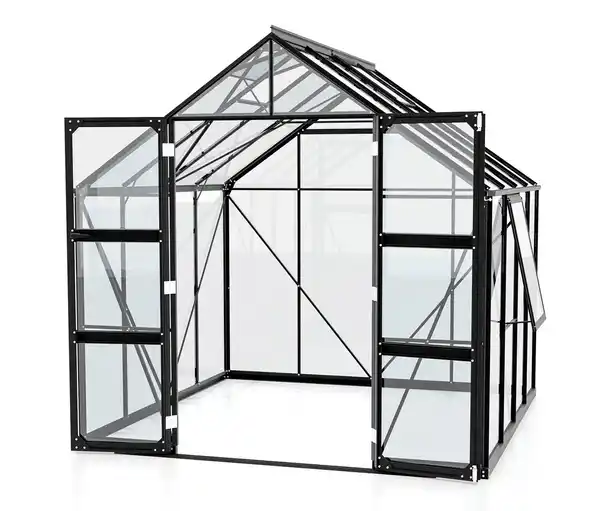 Vitavia Gewächshaus Olymp 6,7m² inkl. Fundamentrahmen Farbe: Schwarz Material: Pulverbeschichtete Aluminiumprofile Verglasung Einscheiben-Sicherheitsglas (ESG) Maße: B x H x T außen ca. 257 x 260 x 261 cm Grundfläche ca. 6,7 m² Firsthöhe ca. 260 cm Traufenhöhe ca. 166 cm Sockelmaß ca. 256 x 263 cm Tür ca. 120 x 200 cm Inhalt: Inkl. Stahlrahmenfundament, 2 Dachfenstern, 1 Seitenfenster, Aufbauanleitung und -material Gewicht: Ca. 323,2 kg Warnhinweise: An sonnigen Tagen ist eine Schattierhilfe empfehlenswert, um den Brennglaseffekt zu vermeiden Technische Details: Inklusive 2 Dachfenstern und 1 Seitenfenster für gute Belüftung und Regenfallrohrset für beide Dachrinnen und eine kugelgelagerte Doppelschiebetüre. Damit sind gute Belüftung, Wasserabführung und ein komfortabler Zugang zum Gewächshaus bereits serienmäßig gesichert. TÜV-zertifizierte breite Doppelflügeltür mit niedriger Türschwelle für komfortablen Zugang Pulverbeschichtete Aluminiumprofile sorgen für dauerhaften Schutz vor Korrosion Verglasung mit kristallklarem Sicherheitsglas (ESG) in 3mm Sicherheitsglas: bruchstabil und bei Beschädigung ohne scharfe Kanten Sonstige Hinweise: Lieferung in 10 Packstücken bis Bordsteinkante per Spedition Keine Inselbelieferung Garantiegeber: E.P.H. Schmidt Herstellergarantie: 15 Jahre auf Konstruktion und Rahmen, Garantiebedingungen unter: www.vitavia.de/service/garantiebestimmungen Räumlicher Geltungsbereich: Deutschland und Österreich Hersteller-Artikel-Nummer: 40004071 Hersteller: E.P.H. Schmidt & Co. GmbH, Höfkerstr. 30, 44149 Dortmund verkauf@eph-schmidt.de Optimale Belüftung dank 2 Dachfenstern und 1 SeitenfensterOffenes und großzügigen DesignHohe Doppelflügeltüren mit bodentiefer TürschwelleVerglasung mit kristallklarem 3 mm Sicherheitsglas (ESG)Verglasungstechnik: Etablierte Federklammertechnik, erleichtert späteren Austausch einzelner ScheibenBietet Pflanzen viel Licht und fördert so das WachstumAbschließbares Stahlschloss mit Aluminium-Türklinke (Schloss nicht im Lieferumfang enthalten)Pulverbeschichtete Aluminiumprofile sorgen für dauerhaften Schutz vor Korrosion15 Jahre Garantie auf Konstruktion und Rahmen