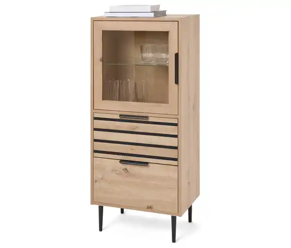 Vitrine »BAAKEN« mit Glastür und 2 Schubladen Farbe: Eichenoptik Füße schwarz Material: Korpus Schubkastenfronten Spanplatte, melaminharzbeschichtet Tür mitteldichte Holzfaserplatte, melaminharzbeschichtet und Einscheiben-Sicherheitsglas Einlegeboden Einscheiben-Sicherheitsglas Fronten mitteldichte Holzfaserplatte, foliert Rückwand mitteldichte Holzfaserplatte, melaminharzbeschichtet Griffe Aluminium pulverbeschichtet Füße Buche, lackiert Maße: B x H x T ca. 51,4 x 114,3 x 35,1 cm B x H x T Schublade innen ca. 44,9 x 23,5 x 28,7 cm Einlegeboden ca. 48,2 x 31 cm Bodenfreiheit ca. 13 cm Inhalt: Inkl. Bodenschonern, Montagematerial und -anleitung Gewicht: Ca. 26 kg Tragkraft: Ablage oben max. 25 kg Einlegeboden max. 5 kg Boden über Schublade max. 15 kg Schublade max. 5 kg Sonstige Hinweise: Artikel wird zerlegt geliefert Lieferung in 2 Packstücken Ein Element unserer »BAAKEN«-Möbel-SerieAus melaminharzbeschichteter Holzwerkstoffplatte mit EichendekorTür beidseitig montierbar mit Klickscharnier, hinter der Tür ein Glaseinlegeboden2 Schubladen mit Seitenauszug und MetallgriffleisteEine der Schubladen in PaneeloptikAufbau auch horizontal möglich, siehe Zeichnungen und Montageanleitung (KF NICHT für MAZ/Katalog)Beine aus Buchenholz, lackiert Stoßfeste, strapazierfähige Kunststoffkanten – besonders langlebigInkl. Wandbefestigung und BodenschonernMADE IN GERMANY