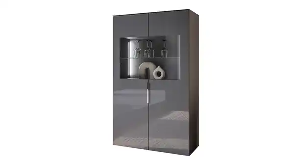 Das elegante und zeitlose Erscheinungsbild unserer Vitrine SANTORIN zieht unweigerlich alle Blicke auf sich. In einem modernen Anthrazit gehalten und mit einer edlen Glasfront versehen, fügt sich das Möbel harmonisch in jede Einrichtung ein. Die glänzenden chromfarbigen Metallgriffe setzen dezente, aber wirkungsvolle Akzente und verleihen dem Möbelstück einen Hauch von Luxus. Das moderne Design wird von den 2 Glastüren vervollständigt. Sie bieten einen Einblick in das Innere der Vitrine, der geradezu einlädt, besondere Gegenstände dekorativ in Szene zu setzen. Ob eine Vase mit frischen Blumen, ein paar stilvolle Kerzenhalter oder eine Sammlung von Fotos - die integrierte Beleuchtung bringt alles perfekt zur Geltung.