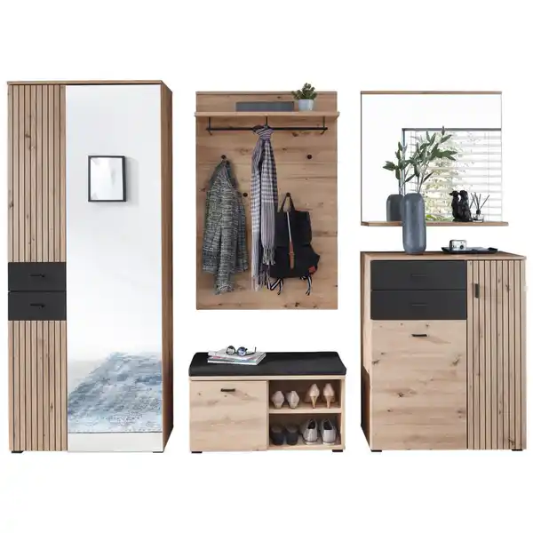 Mit diesem 5-teiligen Voleo Garderoben-Set in Artisan-Eichefarben sowie Schwarz ist Ihr Flur stylish und gleichzeitig funktional ausgestattet. Mit seiner Gestaltung in Holzoptik versprüht es ein gemütliches und freundliches Flair. Absetzungen in mattem Schwarz wie auch Zierfräsungen an der Front verleihen dem Look eine moderne Note. Dunkle Metall-Bügelgriffe komplettieren dezent den aparten Look. An der Kleiderstange des ca. 130 cm hohen Garderobenpaneels kommen Jacken und Mäntel ordentlich unter. 4 Haken warten darauf, Schals oder Taschen entgegenzunehmen. Auf der Hutablage präsentieren Sie Kopfbedeckungen aller Art. Weitere Outdoor-Bekleidung bewahren Sie im Garderobenschrank mit großzügigem Spiegel auf, dessen Inneres von 7 Fachböden sowie einer Kleiderstange strukturiert wird. Im Schuhschrank stehen hinter 2 Drehtüren 8 verstellbare Einlegeböden zur Verfügung, um Ihre Lieblingspaare übersichtlich aufzubewahren. Zubehör wie Schnürsenkel, Pflegemittel und Co. findet in der Schublade mit Soft-Close-System einen Platz, während Sie auf der Oberplatte zum Beispiel Deko-Ideen in Szene setzen. Der rechteckige Parsol-Wandspiegel (B x H: ca. 84 x 80 cm) ergänzt darüber montiert das moderne Möbel-Ensemble um einen glänzenden Akzent. Hier überprüfen Sie vor dem Verlassen des Hauses, ob die Frisur oder das Make-Up Ihren Vorstellungen entspricht. Auf der kleinen Ablage liegen etwa Haustürschlüssel oder Lippenstift griffbereit. Die Garderobenbank komplettiert mit einer Tür plus 2 offenen Fächern nicht nur das Angebot an Aufbewahrungsmöglichkeiten, sondern bietet außerdem auch eine komfortable Sitzgelegenheit beim Anziehen der Schuhe. Eine