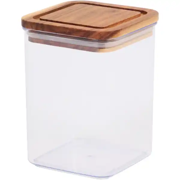 Größe mit Verpackung (LxBxH): 10 x 10 x 13.5 cm, Farbe: Braun, Transparant, Material: Kunststoff, Holz, Anzahl Aufbewahrungsfächer: 1, Art Aufbewahrungsbehälter für Lebensmittel / Getränke: Vorratsbehälter, Form: Viereckig, Inhalt: 0.85 Liter, Material Deckel: Holz, Mikrowellengeeignet: Nein, Mit Deckel: Ja, Mit Literangabe: Nein, Ofenfest: Nein, Spülmaschinenfest: Ja, Tiefkühlbeständig: Nein, Verschlusstyp: Kappe, Artikelnummer: 3220342