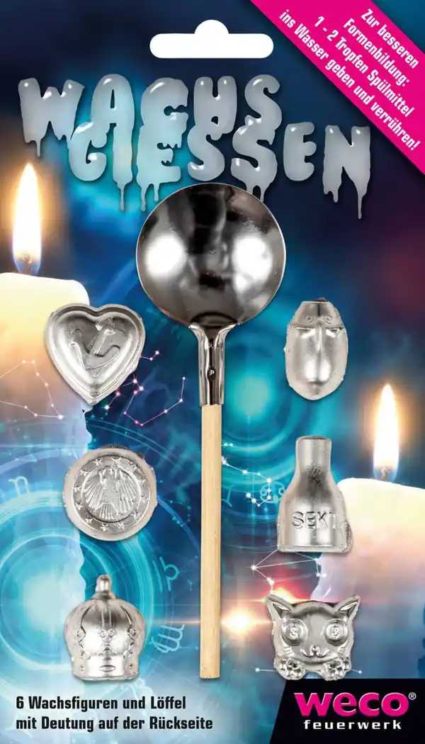 Die umweltfreundliche Alternative zum Bleigießen > Mit 6 Figuren und Löffel > Deutung auf der Rückseite > Silvester-Spaß für die ganze Familie