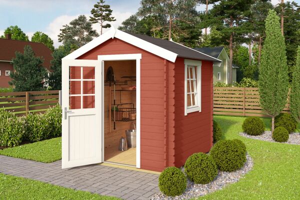 Das Blockbohlenhaus Wels 1. Produziert aus massiven Fichtenholz. Der ideale Ort zum Lagern Ihrer Gartengeräte. Montagematerial & Fußboden bereits im Lieferumfang enthalten, Dachpappe & Schindeln optional.