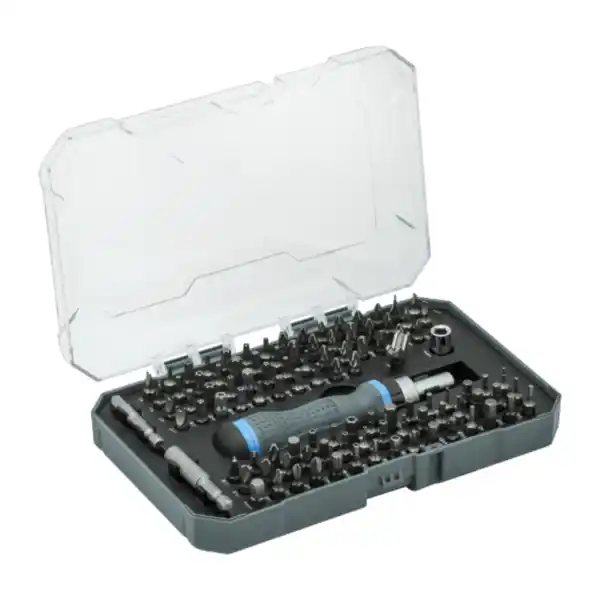 99 Bits, 2 Adapter, 1 magnetischer Bithalter, 1 Eindreh-Bit für Haken, 1 Ratschen-Schraubendreher und 1 Stecknussadapter