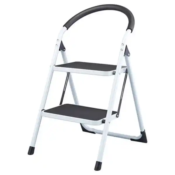 \n- Je Stück - Die klappbare Trittleiter ist in zwei Farbvarianten erhältlich: weiß und grau. Diese kann im Haushalt verwendet werden und der Aufstieg erfolgt über die beiden Stufen mit rutschfesten Profilen. Es gibt einen Sicherheitsmechanismus, der ein unbeabsichtigtes Einklappen der Leiter verhindert und der Tragegriff ist mit Schaumstoff überzogen. Die Leiter misst im aufgestellten und zusammengeklappten Zustand 46 x 59 x 82 cm bzw. 46 x 95 x 15 cm in Breite x Höhe x Tiefe und kann Lasten von bis zu 150 kg tragen