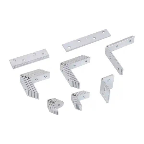 Stahl, verzinkt; Set: 22 Winkel-, 6 Flachverbinder, je verschiedene Größen, 2 Verstell- und 8 Befestigungswinkel