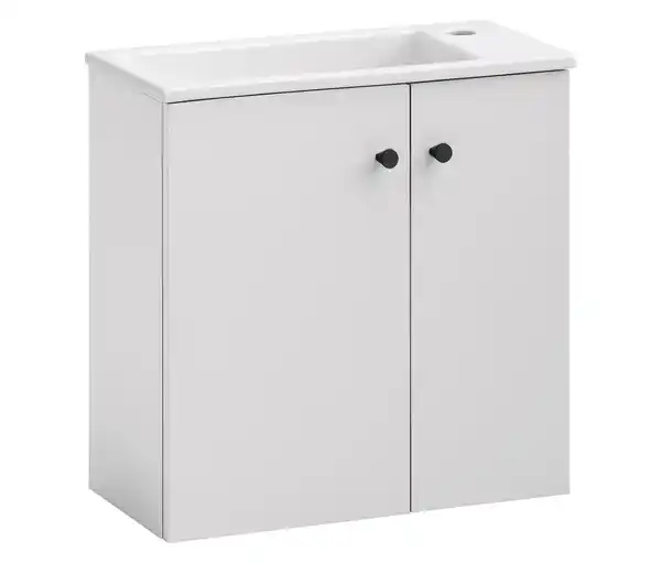 WS Waschtisch »Ebba«, matt weiß Farbe: Matt weiß Waschbecken glänzend weiß Griffe matt schwarz Material: Melaminharzbeschichtete Spanplatte Waschbecken Keramik Griffe und Beschläge Metall Maße: B x H x T ca. 50 x 51,4 x 25 cm B x H x T Türfach ca. 45,5 40 x 23 cm B x H x T Waschbecken außen ca. 50 x 1,8 x 25 cm, innen ca. 35 x 9 x 19 cm Ø Griffe je ca. 2,5 cm Inhalt: Inkl. Montageanleitung Gewicht: Ca. 16 kg Gebrauchsanweisung: Mit einem feuchten, nicht nassen Tuch reinigen. Pflegeprodukte sind nicht notwendig. Warnhinweise: Beiliegende Montageanleitung vollständig beachten. Das Becken hat keinen Überlauf ‒ bei der Montage ist ein Permanentablauf zu verwenden. Sonstige Hinweise: Artikel wird zerlegt geliefert Lieferung in 1 Packstück bis zum Haus Keine Inselbelieferung B x H x T Packstück ca. 67,5 x 22 x 57 cm Waschtisch mit 2 TürenInkl. Waschbecken aus KeramikHängende MontageWandbefestigung erforderlichEinfache Montage mit verständlicher AufbauanleitungMade in Germany