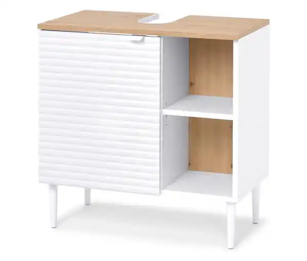 Waschbeckenunterschrank »SONARI« mit Tür Farbe: Weiß Deckplatte natürliche Eichenoptik Material: Korpus, Einlegeböden, Deckplatte Spanplatte, melaminharzbeschichtet Fronten mitteldichte Holzfaserplatte, foliert Rückwand mitteldichte Holzfaserplatte, melaminharzbeschichtet Griffe Aluminium, pulverbeschichtet Füße Buchenholz, lackiert Maße: B x H x T ca. 65,2 x 68,6 x 37,1 cm B x H x T offenes Regal ca. 22,3 x 47,1 x 25,1 cm Stauraum hinter der Tür ca. 37,7 x 26,7 cm Inhalt: Inkl. Wandbefestigung, Bodenschonern, Montagematerial und -anleitung Gewicht: Ca. 17 kg Tragkraft: Tragkraft Ablage oben max. 20 kg Einlegeboden Tür max. 10 kg Unterboden max. 15 kg Einlegeboden Fach max. 8 kg Sonstige Hinweise: Artikel wird zerlegt geliefert Lieferung in 1 Packstück Ein Element unserer »SONARI«-Möbel-SerieSkandinavisches Design mit Fronten in WellenoptikVielseitig mit weiteren Elementen der Serie kombinierbarAus melaminharzbeschichteter Holzwerkstoffplatte, teilweise mit EichendekorOffener und sichtgeschützter StauraumOffenes Fach und Türfach mit je einem höhenverstellbaren Einlegeboden Tür mit Klickscharnieren und Softdämpfung – einfache Montage im HandumdrehenFüße aus Buchenholz, lackiertMit Siphonausschnitt: passend für handelsübliche WaschbeckenStoßfeste, strapazierfähige Kunststoffkanten – besonders langlebigInkl. Wandbefestigung und BodenschonernMADE IN GERMANY