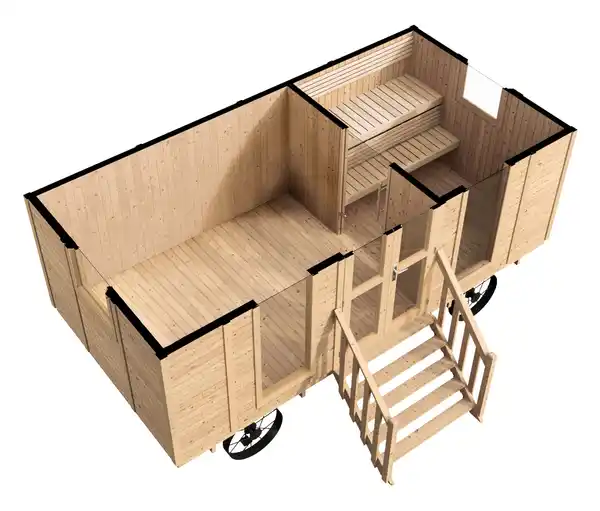 Weka Saunawagon M, 19 mm Farbe: Fichte naturfarben Räder schwarz Material: Holz Europäische Fichte, 19 mm, naturbelassen Doppeltür mit Isoglas Räder Metall Maße: B x H x T Sockelmaß ca. 487 x 313 x 243 cm Lange Fensterelemente ca. 162 x 60 cm Seitenfenster zum Öffnen ca. 80 x 70 cm, zweifachverglast Abstand Untergrund bis untere Kante Eingang ca. 69,8 cm Treppe Breite ca. 126,8 cm Durchgangsmaß Eingangstür ca. 120 x 185 cm Räder Ø je ca. 65 cm, Breite je ca. 10 cm Inhalt: Inkl. Räderset und Leiter, Doppeltür mit Isoglas, 3 Schlüssel, Ruheraum, Saunaraum mit Wandelementen, Saunaofen 9,0 KW mit integrierter Steuerung und Steine und Anschlusskabel und Auffangschale, 2 Fensterelemente, 2 Seitenfenster zum Öffnen mit Dreh-und-Kipp-Beschlag Gewicht: Ca. 1.300 kg Gebrauchsanweisung: Das Produkt wird naturbelassen geliefert und muss mit einer offenporigen Lasur farblich behandelt werden! Achtung: Aufbau nur zu zweit. Handwerkliches Geschick sollte vorhanden sein. Warnhinweise: Kinder nicht unbeaufsichtigt lassen! Sonstige Hinweise: Artikel wird zerlegt geliefert Lieferung in 6 Packstücken per Spedition Anlieferung bis Bordsteinkante Keine Inselbelieferung Keine Lieferung in Spielstraße Keine Lieferung in Sackgasse B x H x T Packstücke 1x ca. 120 x 120 x 380 cm 1x ca. 50 x 70 x 240 cm 1x ca. 60 x 60 x 125 cm 1x ca. 46 x 56 x 46 cm 1x ca. 29 x 10 x 38 cm 1x ca. 26 x 17 x 33 cm Fester Untergrund mit Gehwegplatten oder Streifenfundament ideal2 Räume im Inneren: Saunaraum und RuheraumRäder-Set und Treppe im Lieferumfang enthalten1 Doppeltür, 2 lange Fensterelemente und 2 Seitenfenster aus Iso-SicherheitsglasTür abschließbar, 3 Schlüssel im Lieferumfang enthaltenSeparater Saunaraum mit isolierten Wandelementen9-kW-Saunaofen mit integrierter Steuerung, Steine, Anschlusskabel und Auffangschale im Lieferumfang enthaltenJeweils 1 Fenster im Saunaraum und im Ruheraum, kann nach innen geöffnet werdenMontage durch Elementbauweise, 2 Personen mit handwerklichem Geschick empfohlenDacheindeckung nicht im Lieferumfang enthalten, erhältlich im FachhandelMADE IN EUROPE