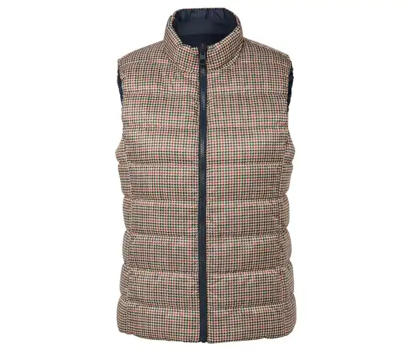 Wende-Steppweste Farbe: 1 Seite dunkelblau, 1 Seite mehrfarbiges Hahnentritt-Dessin Material: 100% Polyester Maße: Gesamtlänge ca. 64,5 cm (Gr. 40) Passform: Regular Fit 1 Weste, 2 LooksLeichte, wärmende WattierungStehkragenVorderseite mit ReißverschlussArmloch mit elastischem Einsatz für optimalen TragekomfortWiener Nähte für eine feminine Silhouette1 Seite dunkelblau, 1 Seite Hahnentritt-DessinDunkelblaue Seite: Eingrifftaschen mit Druckknopf