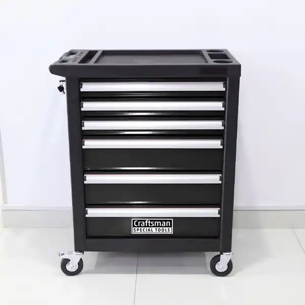 Werkstattwagen 70 tlg. mit 6 Schubladen schwarz Das 6-Schubladen-Werkstattwagen Combo-Tool-Kit enthält eine umfangreiche Auswahl an hochwertigen Werkzeugen, die in einer stabilen Metallkonstruktion untergebracht sind. Das Set umfasst verschiedene Handwerkzeuge wie Hammer, Zangen, Schraubenschlüssel und Steckschlüssel, die für eine Vielzahl von Anwendungen geeignet sind. Der Werkstattwagen ist mit 4 Rollen ausgestattet, sodass er flexibel bewegt werden kann. Ideal für Werkstätten, Garagen oder Heimwerkerprojekte.Gesamtmaße: 760 x 460 x 815 mm (935 mm mit Rädern)6-Schubladen-Werkstattwagen Combo-Tool-Kit 70 Teile (Marke: Craft man)300 g Maschinenhammer, Fiberglasgriff, Kohlenstoffstahl mit H.T.30 mm Gummihammer, Fiberglasgriff, Metall, Kunststoff9 Stück Kombinationsschlüssel, sandgestrahlt, Größen: 6, 8, 9, 10, 11, 12, 13, 14, 17 mm, Kohlenstoffstahl mit H.T.6-teiliges Schraubendreher-Set, Größen: SL6x38 mm, SL3x75 mm, SL4x100 mm, SL5x100 mm, SL6x150 mm, SL8x200 mm, Chrom-Vanadium6 Stück T-Griff-Inbusschlüssel, Größen: H2x100 mm, H2.5x100 mm, H3x100 mm, H4x150 mm, H5x150 mm, H6x150 mm, Kohlenstoffstahl mit H.T.1 Stück 100-250 V Spannungsprüfer, GS/CE-Zulassung1 Stück 160 mm Rundzange, Kohlenstoffstahl mit H.T., hochglanzpoliert, bi-material Griff1 Stück 160 mm Diagonalzange, Kohlenstoffstahl mit H.T., hochglanzpoliert, bi-material Griff1 Stück 160 mm Kombizange, Kohlenstoffstahl mit H.T., hochglanzpoliert, bi-material Griff1 Stück 160 mm Kombizange mit Gelenk, hochglanzpoliert, Vinylgriff, Kohlenstoffstahl mit H.T.1 Stück 250 mm D4 Wasserpumpenzange, sandgestrahlt, Vinylgriff, Kohlenstoffstahl mit H.T.17 Stück 3/8" Steckschlüssel, Größen: 8/9/10/11/12/13/14/15/16/17/18/19/20/21/22/23/24 mm, Kohlenstoffstahl mit H.T.13 Stück 1/4" Steckschlüssel: 4/4,5/5/5,5/6/7/8/9/10/11/12/13/14 mm1 Stück 3/8" Universalgelenk1 Stück 1/4" Universalgelenk1 Stück 3/8" Verlängerung: 75 mm & 125 mm1 Stück 1/4" Verlängerung: 50 mm & 100 mm1 Stück 3/8" T-Schieberegler1 Stück 1/4" T-Schieberegler1 Stück 1/4" Spinnergriff1 Stück 1/4" Ratschen-Steckschlüsseldriver, 72 Zähne mit Schnellwechsel, bi-material Griff, CR-MO, 40CR1 Stück 3/8" Ratschen-Steckschlüsseldriver, 72 Zähne mit Schnellwechsel, bi-material Griff, CR-MO, 40CR1 Stück 6-Schubladen Metall-WagenStärke des Metalls: 0,5 mm / 0,5 mmGesamtmaß: 760 x 460 x 815 mm (935 mm mit Rädern)Mit 4 Rädern, Metall, Kunststoff