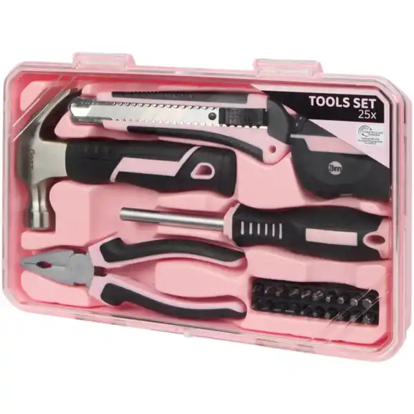 Kleine Arbeiten im Haus lassen sich mit diesem rosafarbenen 25-teiligen Werkzeugset ganz entspannt erledigen. Vom Hammer über Schraubendreher bis hin zum Maßband ist alles dabei und übersichtlich in einem kompakten Koffer verstaut. So hast du für schnelle Reparaturen, zum Aufhängen oder Montieren immer das passende Werkzeug griffbereit. Dank der handlichen Größe lässt sich das Set leicht verstauen und ist jederzeit einsatzbereit.