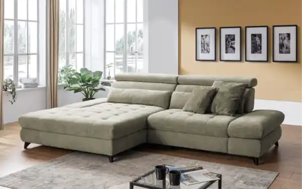 Moderne Wohnlandschaft mit Stoffbezug Altara in Lindgrün, gesteppter Sitz mit hochwertigem PUR Schaum, Rücken aus PUR-Schaum auf Gummigurtung, Rücken echt bezogen,