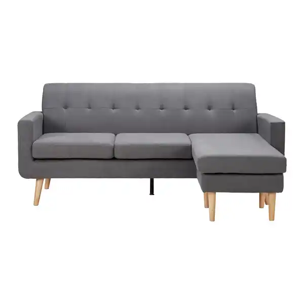 Verleihen Sie Ihrem Wohnzimmer mit diesem geradlinigen und modernen Ecksofa den letzten Schliff. Unter dem weichen Bezug aus Webstoff in zeitlosem Grau mit Knopfsteppung wartet eine bequeme und gemütliche Polsterung aus Schaumstoff und Wellenunterfederung darauf, einen lustigen Filmabend mit Ihnen zu verbringen. Der Unterbau und die Füße sind aus massivem Eukalyptusholz gefertigt und unterstreichen den angesagten Look. Die etwa 196 x 83 x 143 cm (B x H x T) große Wohnlandschaft in L-Form ist bis 360 kg belastbar und passt hervorragend in unterschiedliche Wohnstile. Tipp: Zu dieser grauen Wohnlandschaft passt die komplette Farbpalette. Egal ob knallig Gelb oder dunkles Blau - hier harmoniert jede Interieurfarbe! HINWEIS Dieser Artikel wird in unseren Filialen nicht ausgestellt, ist dort jedoch einfach und bequem bestellbar und wird direkt zu Ihnen nach Hause geliefert. Bitte beachten Sie, dass die abgebildete Dekoration im Lieferumfang nicht enthalten ist