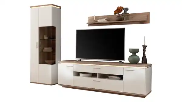 Modernes Design und natürliche Wärme vereinen sich in der Wohnwand PALERMO zu einem stilvollen Highlight für Ihr Wohnzimmer. Die Kombination aus Weiß und der edlen Viking Oak Nachbildung schafft eine harmonische Atmosphäre, die Ruhe und Gemütlichkeit ausstrahlt. Ein besonderes Detail bildet die Standvitrine mit geschroppter 3D-Rückwand, die durch den Glaseinsatz sichtbar wird und für eine beeindruckende Tiefenwirkung sorgt. Für ein angenehmes Ambiente sorgt die integriert LED-Beleuchtung und taucht Ihre Wohnung in ein warmes, stimmungsvolles Licht. Abschließend sorgt die Soft-Close-Funktion für ein leises und komfortables Schließen der Türen und Schubladen. Die 3 perfekt abgestimmten Elemente bieten großzügigen Stauraum und präsentieren sich funktional sowie ästhetisch zugleich. Ob als stilvolle Bühne für Dekoration oder als praktisches Ordnungssystem - diese Wohnwand verbindet Form und Funktion auf höchstem Niveau. Bestellen Sie noch heute Ihre neue Wohnwand oder lassen Sie sich von einem unserer Experten beraten.Wir freuen uns auf Sie!