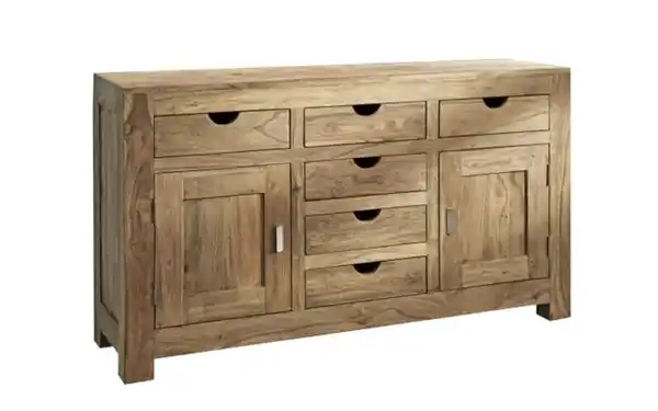 Ausführung in Shisham natur massiv, 2 Türen, 6 Schubkästen, B/H/T ca. 140 x 80 x 40 cm.