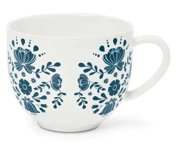 XL-Milchkaffeetasse Farbe: Cremeweiß Material: Porzellan Maße: Höhe ca. 9,8 cm Ø ca. 12 cm, Stellfläche ca. 6 cm Inhalt: Inkl. Merkblatt für die Benutzung von Mikrowelle und Backofen Füllmenge: Nutzbares Volumen ca. 650 ml Warnhinweise: ACHTUNG. Nur zum Erwärmen im Backofen – nicht zum Backen geeignet PorzellanÜbergroße Tasse, ideal für Milchkaffee, Kakao, Müsli oder TeeFüllvolumen ca. 650 mlMit dunkelblauem Blumendekor
