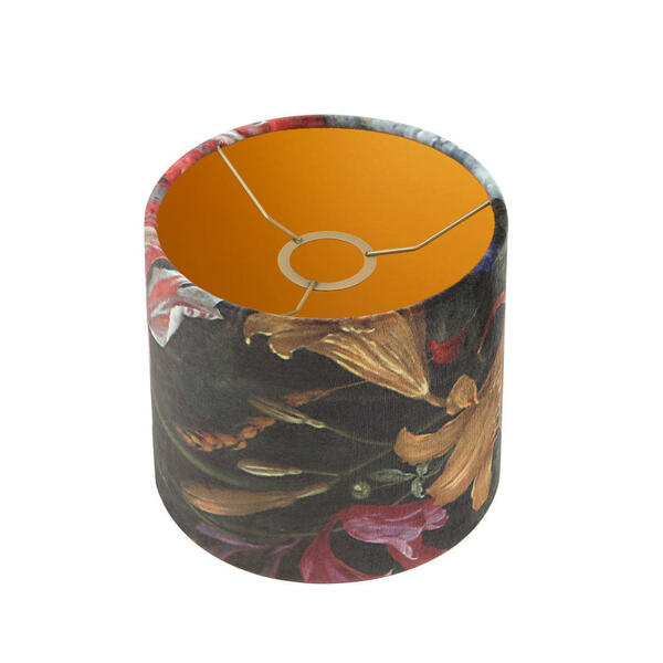 Leuchtenschirm Velour, aus dem Material Metall, Textil und das Design Blume. die Form des Artikels ist zylindrisch. die Lampe hat die Fassung E27. Der Artikel hat eine Größe von 23 cm.