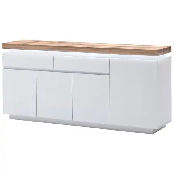 Diese Kommode aus der Serie 'Romina' in Weiß ist praktisch und extravagant. Dank 2 Schubladen und 4 Türen lassen sich Ihre Accessoires ideal verstauen. Der Vorteil: Die Türen lassen sich grifflos öffnen. Das Sideboard wird mit fest integrierten LED-Lampen geliefert. Außerdem besticht das Möbelstück durch die schöne Farbgebung: Die Oberfläche ist in Eichefarben gehalten. Überzeugen Sie sich selbst und setzen Sie mit dieser Kommode moderne Akzente in Ihrem Wohnzimmer!
