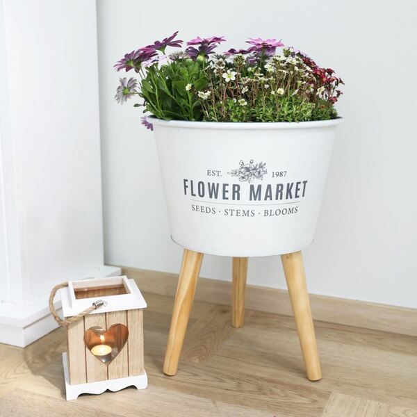 Moderner Zinktopf auf drei stabilen Holzbeinen und dem Schriftzug "Flower Market" für Ihre bepflanzte Innendekoration.