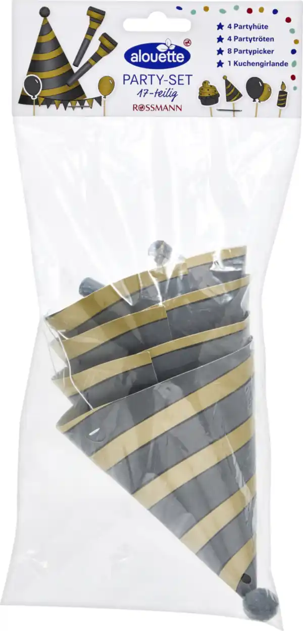 Bereit für die Party! Unser Party Set bringt Farbe und Spaß in jede Feier – mit Partyhüten, Partytröten, Partypickern und einer zauberhaften Kuchengirlande. Perfekt, um deine Party unvergesslich zu machen!Inhalt: 17-teilig
