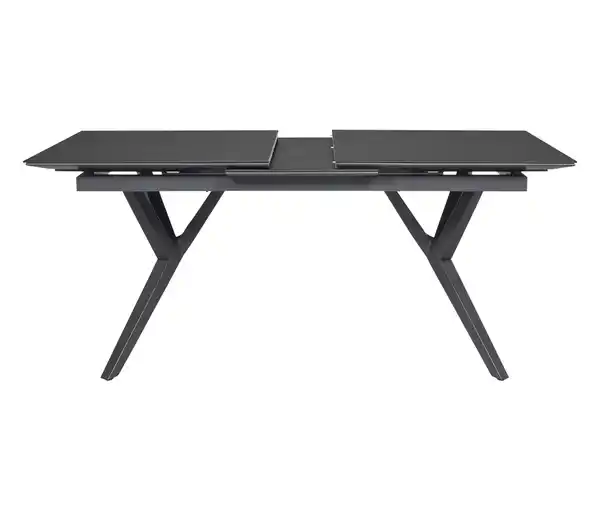 deVries Ausziehtisch, 160/210, Gabel-Tischgestell, anthrazit Farbe: Tischplatte und Gestell anthrazit Material: Tischplatte gesinterter Stein Gestell Aluminium, pulverbeschichtet Beschläge Edelstahl Maße: B x H x T ca. 160/210 x 76 x 90 cm Bodenfreiheit ca. 65 cm Inhalt: Inkl. Pflegehinweisen, Montagematerial und -anleitung Gewicht: Ca. 45 kg Tragkraft: Max. 60 kg Gebrauchsanweisung: Pflege: Bitte reinigen Sie Ihre Gartenmöbel nicht mit einem Hochdruckreiniger, da der Wasserdruck die Oberflächen zerstören kann. Die Reinigung können Sie mit einem Tuch oder einer weichen Bürste und klarem Wasser bzw. milder Seifenlauge vornehmen. Anschließend sollten Sie die Möbel mit klarem Wasser abspülen und mit einem Tuch sorgfältig nachtrocknen. Entfernen Sie Feuchtigkeit durch z.B. Flüssigkeiten aus umgestoßenen Gläsern schnellstmöglich mit einem weichen Tuch und lauwarmem Wasser sowie milder Seifenlauge. Stellen Sie keine heißen Gegenstände, wie z.B. Teelichter sowie fettige oder ölige Gegenstände auf die Tischplatte. Dieses könnte permanente Flecken verursachen. Bitte vermeiden Sie den Kontakt mit scharfen und spitzen Gegenständen, um eine Verletzung der Oberflächen zu vermeiden. Bitte vermeiden Sie den Kontakt mit scharfen und spitzen Gegenständen, um eine Verletzung der Oberflächen zu vermeiden. Warnhinweise: Während der Benutzung von verstellbaren Elementen nicht in bewegende Teile fassen. Es besteht Quetschgefahr. Warnung! Fehlgebrauch: Ihr Möbelstück darf nicht als Aufstiegshilfe verwendet werden. Steigen, legen oder setzen Sie sich niemals auf Schubkästen, Einlegeböden oder auf nicht dafür vorgesehene Möbelteile. Achten Sie besonders auf Kinder. Achtung! Kippgefahr: Stellen oder setzen Sie sich niemals auf die ausgefahrene/ausgeklappte Lehne, Beinteil oder Armlehne des Möbels. Es könnte dadurch beschädigt werden und/oder kippen. Ziehen oder schieben Sie das Möbelstück nicht. Durch Schieben, Umbauen und Rangieren können die Füße leicht verbiegen oder abbrechen, auch der Bodenbelag kann Schaden nehmen. Heben Sie es zum Versetzen an Sonstige Hinweise: Artikel wird zerlegt geliefert Lieferung in 1 Packstück auf Palette per Spedition bis Bordsteinkante Keine Inselbelieferung Moderner Ausziehtisch mit filigranem TischgestellEinfach per Synchronauszug von 160 auf 210 cm erweiterbarVielseitig kombinierbarGabel-GestellTischplatte aus gesintertem SteinGestell aus pulverbeschichtetem AluminiumUV- und witterungsbeständig