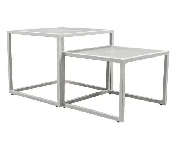 deVries Beistelltische, 2er-Set Farbe: Tischplatte hellgrau Gestell beige Material: Tischplatte gesinterter Stein Gestell Aluminium, pulverbeschichtet Beschläge Edelstahl Maße: B x H x T 1x ca. 50 x 43 x 50 cm, 1x ca. 45 x 33 x 45 cm Inhalt: Inkl. Pflegehinweisen Gewicht: Groß ca. 6,8 kg, klein ca. 5,5 kg Tragkraft: Je max. 30 kg Gebrauchsanweisung: Pflege: Bitte reinigen Sie Ihre Gartenmöbel nicht mit einem Hochdruckreiniger, da der Wasserdruck die Oberflächen zerstören kann. Die Reinigung können Sie mit einem Tuch oder einer weichen Bürste und klarem Wasser bzw. milder Seifenlauge vornehmen. Anschließend sollten Sie die Möbel mit klarem Wasser abspülen und mit einem Tuch sorgfältig nachtrocknen. Entfernen Sie Feuchtigkeit durch z.B. Flüssigkeiten aus umgestoßenen Gläsern schnellstmöglich mit einem weichen Tuch und lauwarmem Wasser sowie milder Seifenlauge. Stellen Sie keine heißen Gegenstände, wie z.B. Teelichter sowie fettige oder ölige Gegenstände auf die Tischplatte. Dieses könnte permanente Flecken verursachen. Bitte vermeiden Sie den Kontakt mit scharfen und spitzen Gegenständen, um eine Verletzung der Oberflächen zu vermeiden. Bitte vermeiden Sie den Kontakt mit scharfen und spitzen Gegenständen, um eine Verletzung der Oberflächen zu vermeiden. Warnhinweise: Während der Benutzung von verstellbaren Elementen nicht in bewegende Teile fassen. Es besteht Quetschgefahr. Warnung! Fehlgebrauch: Ihr Möbelstück darf nicht als Aufstiegshilfe verwendet werden. Steigen, legen oder setzen Sie sich niemals auf Schubkästen, Einlegeböden oder auf nicht dafür vorgesehene Möbelteile. Achten Sie besonders auf Kinder. Achtung! Kippgefahr: Stellen oder setzen Sie sich niemals auf die ausgefahrene/ausgeklappte Lehne, Beinteil oder Armlehne des Möbels. Es könnte dadurch beschädigt werden und/oder kippen. Ziehen oder schieben Sie das Möbelstück nicht. Durch Schieben, Umbauen und Rangieren können die Füße leicht verbiegen oder abbrechen, auch der Bodenbelag kann Schaden nehmen. Heben Sie es zum Versetzen an Sonstige Hinweise: Artikel wird montiert geliefert Lieferung in 1 Packstück per Spedition bis Bordsteinkante Keine Inselbelieferung Separate Tische in 2 verschiedenen Größen, ineinander schiebbarTischplatte aus gesintertem SteinGestelle aus pulverbeschichtetem AluminiumAuch einzeln stellbarUV- und witterungsbeständig