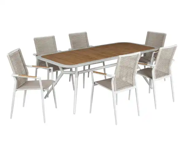 deVries Dining-Set Farbe: Tischplatte und Armlehnen Teak naturfarben Gestell weiß Sitzfläche und Rückenlehne beige Material: Tisch und Stuhlgestell Aluminium, pulverbeschichtet Tischplatte 12-mm-Teakholz, unbehandelt Geflecht 6-mm-Textilen Armlehnen mit Teakholz-Applikationen, unbehandelt Maße: B x H x T Stühle je ca. 58 x 92 x 65 cm Höhe Rückenlehne je ca. 51 cm Sitzhöhe je ca. 46 cm Sitzbreite je ca. 45 cm Sitztiefe je ca. 47 cm Armlehnenhöhe je ca. 66 cm B x H x T Tisch ca. 220 x 75 x 100 cm Bodenfreiheit ca. 70 cm Stärke Tischplatte ca. 12 mm Inhalt: Inkl. Pflegehinweisen, Montagematerial und -anleitung Gewicht: Tisch ca. 31,5 kg Stühle je ca. 5 kg Tragkraft: Stühle je max. 150 kg Tisch max. 30 kg Gebrauchsanweisung: Pflege: Bitte reinigen Sie Ihre Gartenmöbel nicht mit einem Hochdruckreiniger, da der Wasserdruck die Oberflächen zerstören kann. Die Reinigung können Sie mit einem Tuch oder einer weichen Bürste und klarem Wasser bzw. milder Seifenlauge vornehmen. Anschließend sollten Sie die Möbel mit klarem Wasser abspülen und mit einem Tuch sorgfältig nachtrocknen. Entfernen Sie Feuchtigkeit durch z.B. Flüssigkeiten aus umgestoßenen Gläsern schnellstmöglich mit einem weichen Tuch und lauwarmem Wasser sowie milder Seifenlauge. Stellen Sie keine heißen Gegenstände, wie z.B. Teelichter, sowie fettige oder ölige Gegenstände auf die Tischplatte. Dieses könnte permanente Flecken verursachen. Bitte vermeiden Sie den Kontakt mit scharfen und spitzen Gegenständen, um eine Verletzung der Oberflächen zu vermeiden. Bitte vermeiden Sie den Kontakt mit scharfen und spitzen Gegenständen, um eine Verletzung der Oberflächen zu vermeiden. Warnhinweise: Während der Benutzung von verstellbaren Elementen nicht in bewegende Teile fassen. Es besteht Quetschgefahr. Warnung! Fehlgebrauch: Ihr Möbelstück darf nicht als Aufstiegshilfe verwendet werden. Steigen, legen oder setzen Sie sich niemals auf Schubkästen, Einlegeböden oder auf nicht dafür vorgesehene Möbelteile. Achten Sie besonders auf Kinder. Achtung! Kippgefahr: Stellen oder setzen Sie sich niemals auf die ausgefahrene/ausgeklappte Lehne, Beinteil oder Armlehne des Möbels. Es könnte dadurch beschädigt werden und/oder kippen. Ziehen oder schieben Sie das Möbelstück nicht. Durch Schieben, Umbauen und Rangieren können die Füße leicht verbiegen oder abbrechen, auch der Bodenbelag kann Schaden nehmen. Heben Sie es zum Versetzen an Sonstige Hinweise: Stühle werden montiert geliefert Tisch wird zerlegt geliefert Lieferung auf Palette per Spedition bis Bordsteinkante Keine Inselbelieferung Stühle mit Teakholz-Armlehnen, Tisch mit eingelassener Teakholz-TischplatteTischgruppe aus 6 Stapelstühlen und einem GartentischTisch- und Stuhlgestell aus rostresistentem Aluminium, besonders langlebig, pflegeleicht und witterungsbeständigArmlehnen und Tischplatte aus hochwertigem Teak-Massivholz, unbehandeltUV- und witterungsbeständig