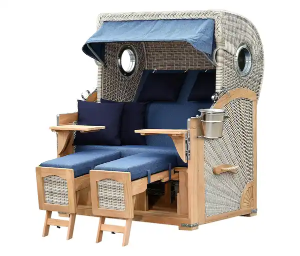 deVries Strandkorb, Teak, XL, mit Champagnerkühler Farbe: Innenpolster und Markise blau Deko- und Kopfkissen dunkelblau Korpus hellgrau Holzelemente Teak naturfarben Champagnerkühler silberfarben Material: Rahmen Teakholz, unbehandelt Korbgeflecht 100% Polyethylen Bezüge 100% Olefin Schaum Polyurethan Bullaugen tempered glass Champagnerkühler Edelstahl Maße: B x H x T aufgeklappt (ohne Rollen) ca. 140 x 160 x 161 cm, zusammengeklappt ca. 140 x 155 x 99 cm B x H x T Sitzfläche (ohne Kissenausstattung) ca. 125 x 50 x 50 cm B x H x T Sitzpolster ca. 123 x 12 x 50 cm Maximaler Auszug der Fußstützen ca. 61 cm Breite Fußstützen je ca. 33 cm B x H x T Fußpolster je ca. 32 x 12 x 61 cm B x H x T Rückenpolster ca. 123 x 6 x 75 cm B x H x T Cocktailschwenktische je ca. 30 x 2 x 24 cm Höhe Doppellenkrollen je ca. 7 cm B x H x T Champagnerkühler ca. 23 x 21 x 29 cm Inhalt: Inkl. Champagnerkühler mit Halterung, Kissenausstattung, Markise, 2 Fußstützen, 2 Cocktailschwenktischen, 2 Bullaugen, 2 Transportgriffen, 4 Doppellenkrollen, Premium-Schutzhaube und Pflegehinweisen Gewicht: Strandkorb ca. 95 kg Champagnerkühler ca. 2 kg Tragkraft: Sitzbank max. 140 kg Fußstützen je max. 25 kg Cocktailschwenktische je max. 2 kg Champagnerkühler max. 10 kg Gebrauchsanweisung: Kunststoffgeflecht Das für unsere Strandkörbe eingesetzte PE Geflecht ist witterungs- und UV-beständig, voll recyclebar und besonders pflegeleicht. Die Reinigung erfolgt nur mit Wasser, Schwamm und Seife. Verwenden Sie bitte keine tensidehaltigen Reinigungsmittel. Bei stärkerer Verschmutzung empfiehlt sich der Einsatz eines speziellen Kunststoffreinigers. Holzteile Zum Schutz vor Witterungseinflüssen sind die Holzteile der meisten Körbe mit einer handelsüblichen Holzschutzlasur imprägniert. Erneuern Sie diese bei Bedarf je nach Verschleiß und lassen Sie sich beim Kauf der Lasur im Fachgeschäft beraten. Die Strandkorbmodelle aus Teak müssen nicht behandelt werden, da Teakholz durch seinen hohen Gehalt an natürlichen Ölen sehr witterungsbeständig ist. Der Witterung ausgesetztes Teakholz erhält mit der Zeit eine silbergraue Patina. Diese können Sie von Anfang an durch die frühzeitige Verwendung von Teak-Öl verhindern. (Bitte nur auf sauberes und trockenes Holz auftragen.) Grundsätzlich sollten Sie den Korb mit einer Schutzhaube vor Witterung schützen. Bei längerer Nichtbenutzung (z. B. während der Überwinterung) muss der Korb trocken und gut gelüftet sein. Zwischen Haube und Korbdach können Sie zusätzlich ein Frotteetuch legen, um eventuell entstandenes Schwitzwasser zu reduzieren und damit verbundene Stockflecken zu vermeiden. Legen Sie vier stabile Steine unter die Korbecken, damit verhindern Sie, dass Nässe von unten in das Holz eindringt. Sofern Wind und Wetter es zulassen, sollten Sie die Haube regelmäßig abnehmen und Ihren Korb gut lüften. Die herausnehmbaren Kissenausstattungen und Fußpolster sind alle mit einem Reißverschluss ausgestattet und lassen sich waschen. Bitte beachten Sie die Pflegehinweise auf dem Textiletikett. Strandkörbe sind nicht wasserdicht. Bei Regen entweder Schutzhülle benutzen oder alle Kissen aus dem Korb entfernen. Um Schimmelbefall zu vermeiden, muss der Korb regelmäßig belüftet werden. Die Kissenausstattungen sollten Sie zur Überwinterung grundsätzlich herausnehmen. Vor Schädlingen können Sie Ihren Korb durch die Verwendung von Zedernholzstückchen schützen – wirkungsvoll und umweltfreundlich Das Abkippen des Oberkorbes gelingt am besten, wenn Sie die Verstellgriffe nacheinander lösen, wobei Sie beim Lösen des zweiten Griffs den Korb in die gewünschte Position neigen und diesen wieder einhaken können. Montage des Strandkorbes und Verstellen der Rückenlehne mit 2 Personen. Den Strandkorb nicht ohne Kissenausstattung verwenden! Warnhinweise: Warnung! Fehlgebrauch Ihr Möbelstück darf nicht als Aufstiegshilfe verwendet werden. Steigen, legen oder setzen Sie sich niemals auf Schubkästen, Einlegeböden oder auf nicht dafür vorgesehene Möbelteile. Achten Sie besonders auf Kinder. Ziehen Sie in regelmäßigen Abständen alle Schraubverbindungen zu Ihrer Sicherheit nach. Setzen Sie den Korb nur entsprechend seinem Verwendungszweck ein und überlasten Sie ihn nicht. Der Korb ist ausschließlich für den Privatgebrauch vorgesehen. Sonstige Hinweise: Artikel wird montiert geliefert Lieferung auf Palette per Spedition bis Bordsteinkante Keine Inselbelieferung Aufgebauter Teak-Strandkorb in komfortabler Ausstattung für 2 Person inkl. Rollen, Schutzhaube und ChampagnerkühlerInkl. Zubehör bestehend aus Doppellenkrollen und Premium-Schutzhaube und ChampagnerkühlerOberkorb mit Flechtung aus robusten Polyrattan und Doppelflechtung mit dazwischenliegender Schutzfolie4-fach verstellbarer Oberkorb für hohen Sitz-Liege-Komfort2 große Cocktailschwenktischen2 voll ausziehbare Fußteile mit Fronten aus Holz und Geflecht2 Fußteil-PolsterAluminium-Bullaugen in beiden Korbseiten ‒ dekorative Lichtquelle und maritimer LookInkl. 2 Dekokissen und 2 fixierbarer KopfkissenPolster- und Kissenbezüge aus hochwertigem Olefinstoff ‒ Haptik und Optik laden zum Wohlfühlen einAlle Polster- und Kissenbezüge sowie die Markise abziehbar und nach Angaben waschbarChampagnerkühler und Beschläge aus hochwertigem EdelstahlUV- und witterungsbeständig
