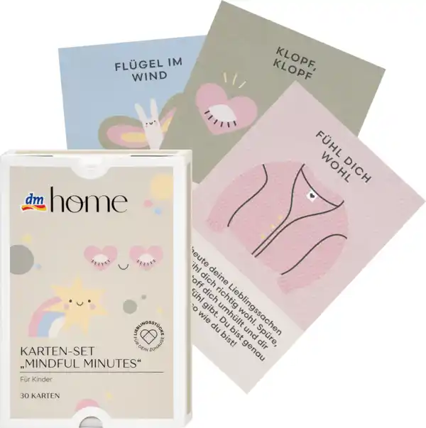 Das "MINDFUL MINUTES" Kartenset für Kinder von dm home lädt die Kleinen dazu ein, spielerisch Achtsamkeit zu entdecken. Mit einer bunten Mischung aus motivierenden Affirmationen und altersgerechten Achtsamkeitsübungen bietet jede Karte eine kleine Portion Happiness. Ob als täglicher Begleiter oder für besondere Momente – dieses Set unterstützt Kinder dabei, positive Gedanken zu entwickeln und den Moment zu genießen. Eine liebevolle Inspiration für mehr Gelassenheit und Freude im Alltag.