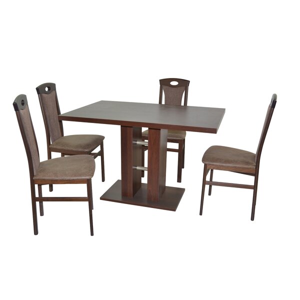 Hochwertige 5tlg. Essgruppe bestehend aus 4 Massivholzstühlen und 1 Esstisch. Stühle aus Massivholz Buche, nussbaumfarben gebeizt und lackiert. Sitz und Rücken sind bequem schaumstoffgepolstert und mit attraktiven Stoffbezügen bezogen. Sitz mit einem Bezug