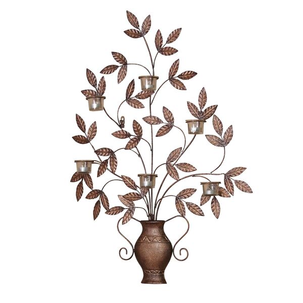 Metall-Wanddekoration "Krug mit Zweigen" bestückt mit 6 Glas-Teelichthaltern (ohne Teelichter). Oberfläche antik bronce/braun. Zur Wandmontage. Maße ca. cm: B. 63 x T. 8 x H. 87 cm. Breite ca. cm: 63 Farbe: bronce/braun Höhe ca. cm: 87 KMDE: onesize