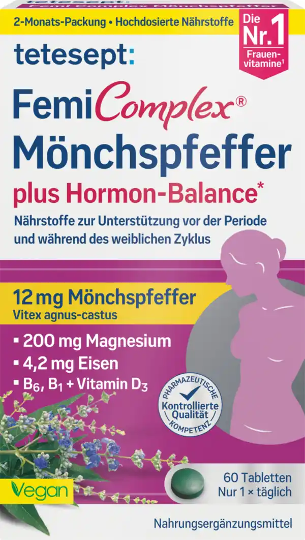 Mit der speziellen Zusammensetzung an Nährstoffen sind die FemiComplex Mönchspfeffer Tabletten von tetesept darauf ausgelegt den weiblichen Zyklus in seinen verschiedenen Phasen zu unterstützen. Die Tabletten enthalten 12 mg Mönchspfeffer und weitere Nährstoffe, wie Eisen, Vitamin B1, B5 und B6. Dabei kann Vitamin B6 zur Regulierung der Hormontätigkeit und zur normalen physischen Funktion beitragen. Vitamin B3 unterstütz wiederum einen normalen Energiestoffwechsel und Vitamin B5 leistet einen Beitrag zur normalen geistigen Leistung. Dank des enthaltenen Eisens kann zudem das Gefühl von Müdigkeit und Erschöpfung verringert werden. Dabei ist das Nahrungsergänzungsmittel durch seine Tablettenform einfach einzunehmen und muss nur einmal täglich zu sich genommen werden. Dieser Artikel ist für Express-Bestellungen verfügbar oder in unseren dm-Märkten erhältlich.