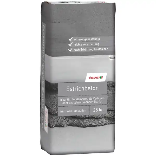 für den Innen- und Außenbereich geeignet|universell verwendbar|für Estricharbeiten|nach dem Aushärten witterungsbeständig und frostsicher|Sackinhalt ergibt ca. 12,5 l fertigen Zement; Bauprojekte im Eigenheim lassen sich schnell und unkompliziert mit dem Estrichbeton unserer toom Qualitätsmarke umsetzen. Ob die Erstellung von Betonteilen oder auch das Gießen von Fundamenten: Für alle Tätigkeiten dieser Art ist der Estrichbeton geeignet. Er ist leicht anzumischen und lässt sich sehr gut verarbeiten. Zum Anmischen benötigst du lediglich Wasser. Beachte bitte die detaillierten Anwendungs- und Sicherheitshinweise auf der Verpackung.