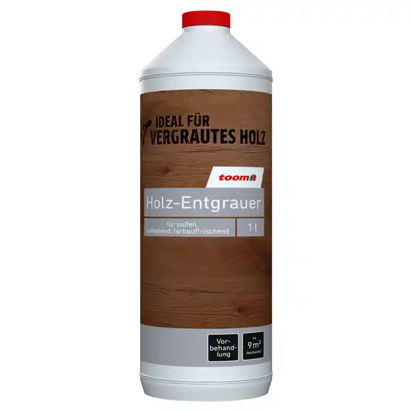 Reinigungsmittel für vergraute Gartenhölzer|geruchsarm, leicht aufzutragen|hellt auf und unterstützt natürliche Farbfrische|frei von Löse- und Konservierungsmitteln; Ein Projekt beinhaltet häufig die Pflege von Oberflächen. Ist das bei deinem Vorhaben der Fall? Dann solltest du dir diesen Holzentgraue von Toom einmal genauer anschauen. Dabei verpasst er deinem Werkstück einen Anstrich in einem natürlichen Farbton. Mit der Gebindegröße von 1 l kannst du bei einem Anstrich eine Fläche von 9 m² behandeln. Für ein ansprechendes Ergebnis werden aber 2 Anstriche empfohlen. Erfahre mehr darüber, wie du einen starken Holzschutz für deine Projekte im Innen- und Außenbereich schaffst.