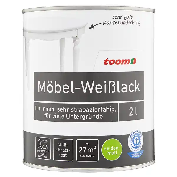 zum Schutz von Möbeloberflächen|geruchsarm und schnell trocknend|stoß- und kratzfest|ausgezeichnet mit dem "Blauer Engel"; Ist dieser Lack vielleicht das, was dein Projekt noch braucht? Du kannst diesen Möbel-Weißlack von Toom für den Möbelschutz von Holz, Metall und Kunststoff nutzen. Vor dem Auftrag solltest du eine Grundierung verwenden. Große Flächen von bis zu 27 m² lassen sich mit dem Inhalt von 2 l bei einem einmaligen Anstrich behandeln. Beachte, dass du bei 2 Anstrichen mit dem Anstrichmittel ein ansprechendes Ergebnis erzielst und eine seidenmatte Oberfläche schaffst. Wenn du es im Innenbereich nutzt, brauchst du keine Bedenken haben. Darüber hinaus ist es durch seine Wasserbasis nahezu geruchslos. Der Möbel-Weißlack ist 2 Stunden nach dem Anstrich getrocknet und kann zu guter Letzt nach 12 Stunden überstrichen werden. Erfahre mehr darüber, wie du deine Bauprojekte richtig lackierst.
